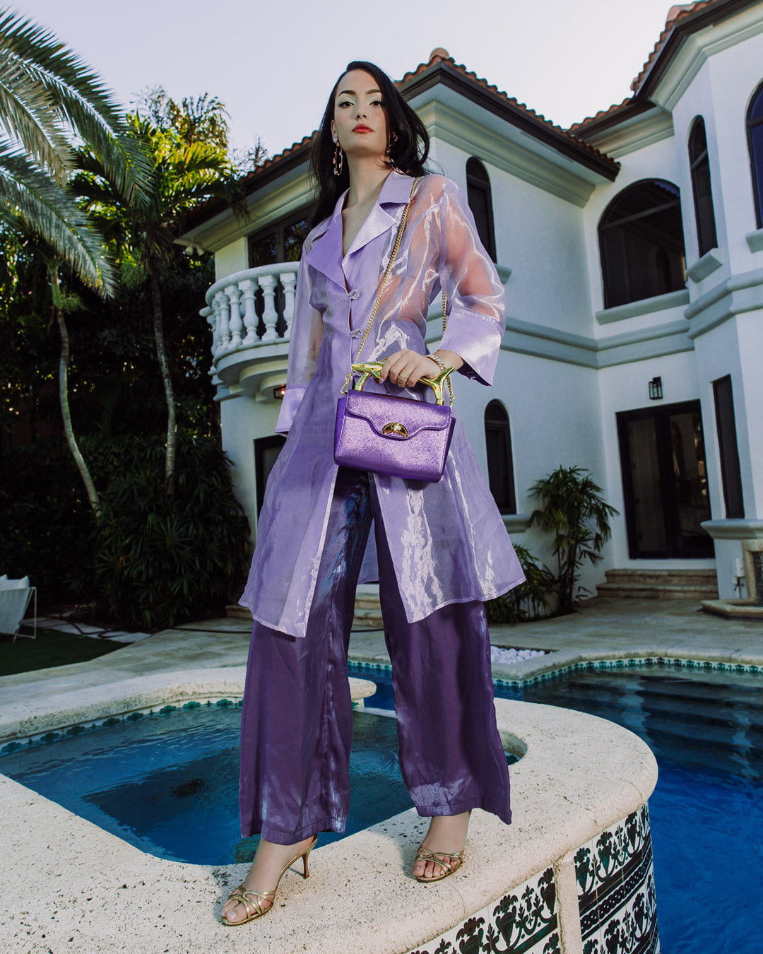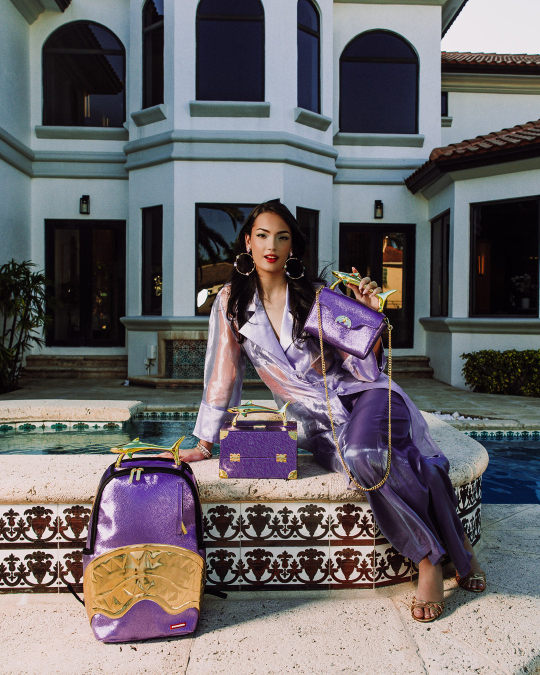 Shimmer and shine! Custom shark molded handle clutch with metallic purple fabric. Includes optional chain for crossbody wear and turn lock. Includes one interior pocket. HANDLE WITH CARE!