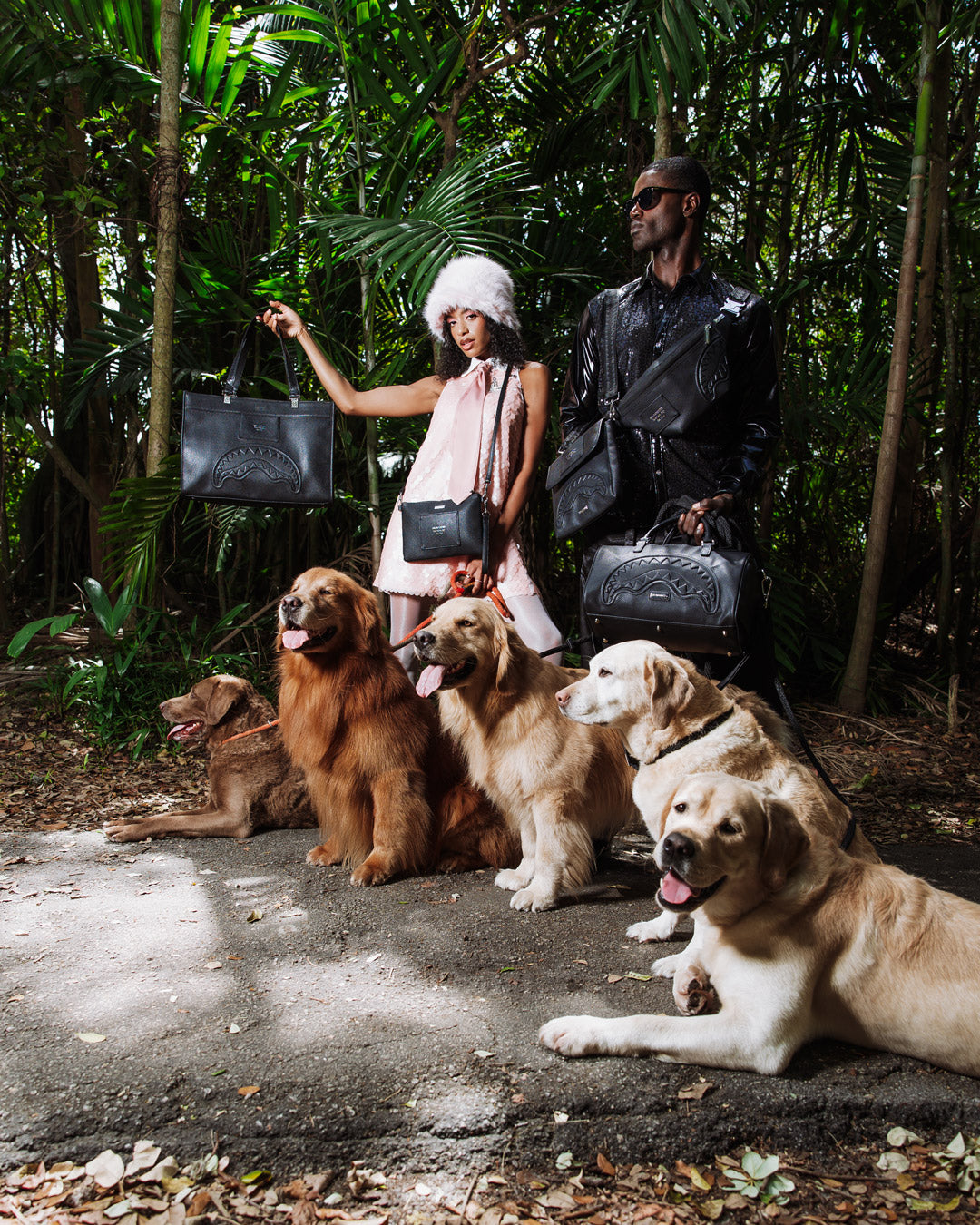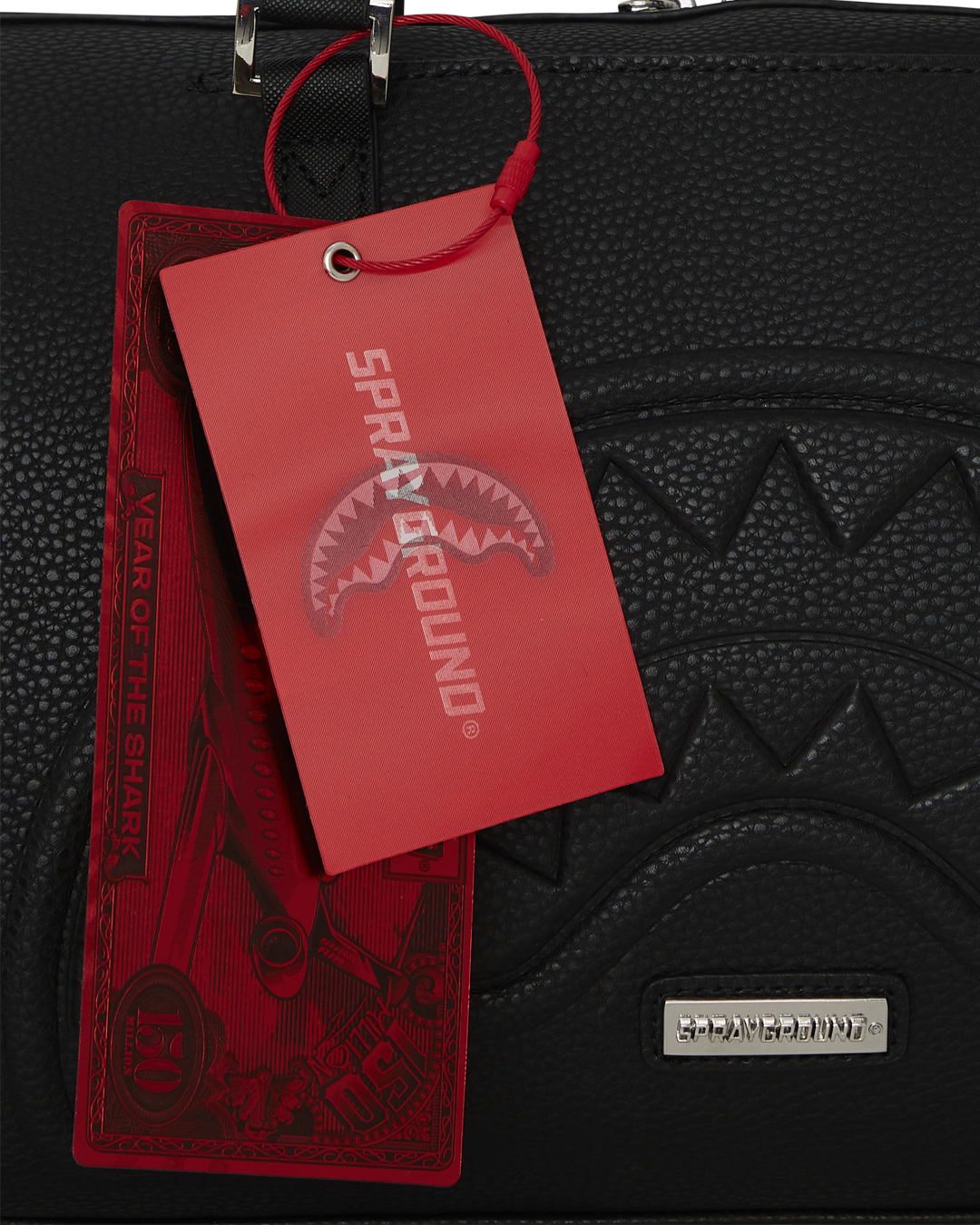 Cut and sew sharkmouth shape with embossed silver foil lettering.